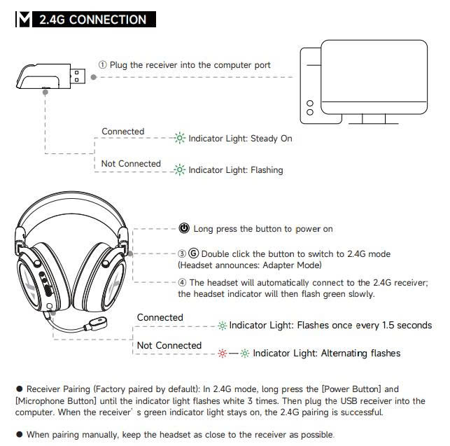 • 2.4G đã kết nối: Xanh lá nhấp nháy chậm