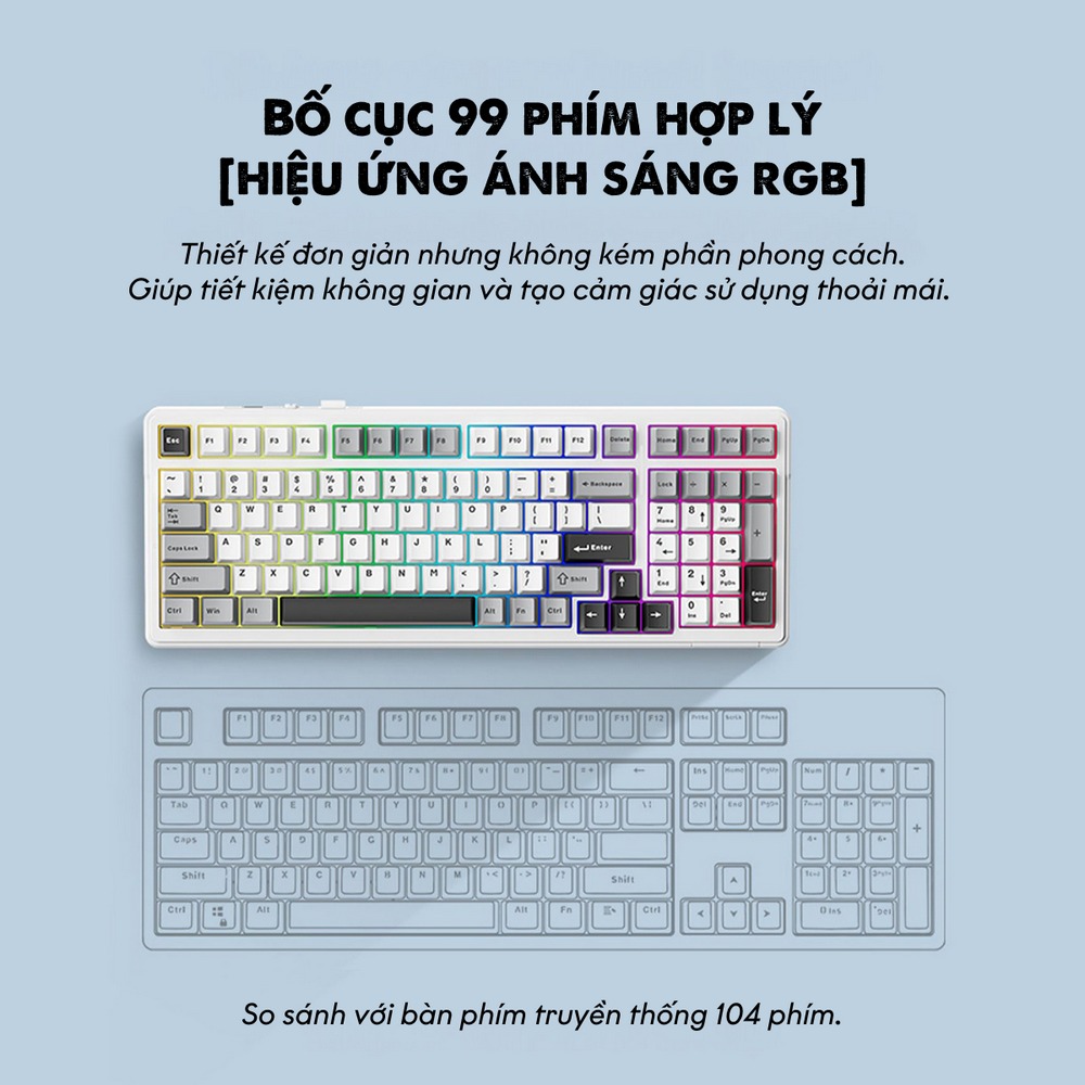 - Số lượng phím: 99 phím - Chất liệu keycap: Nhựa PBT