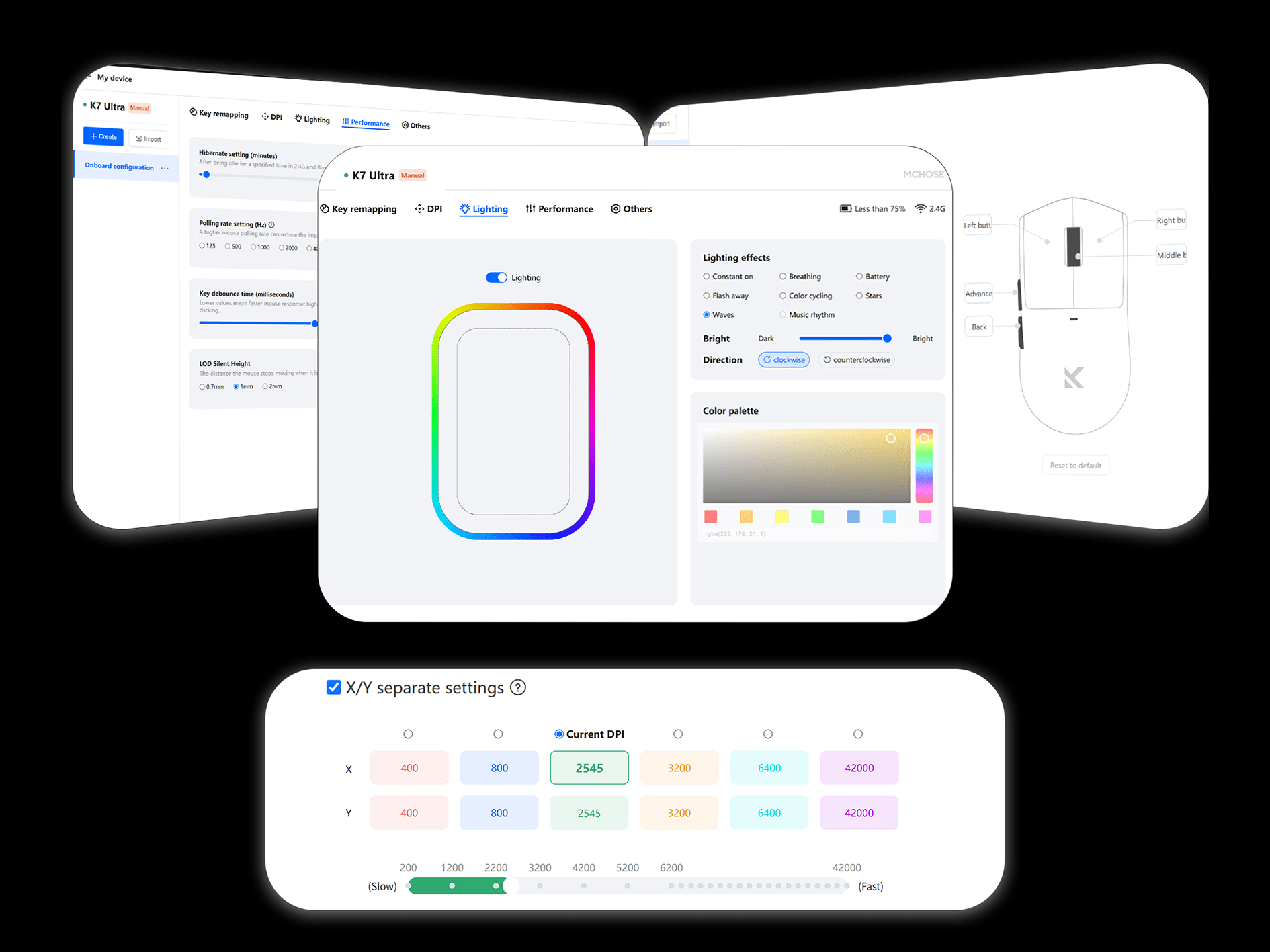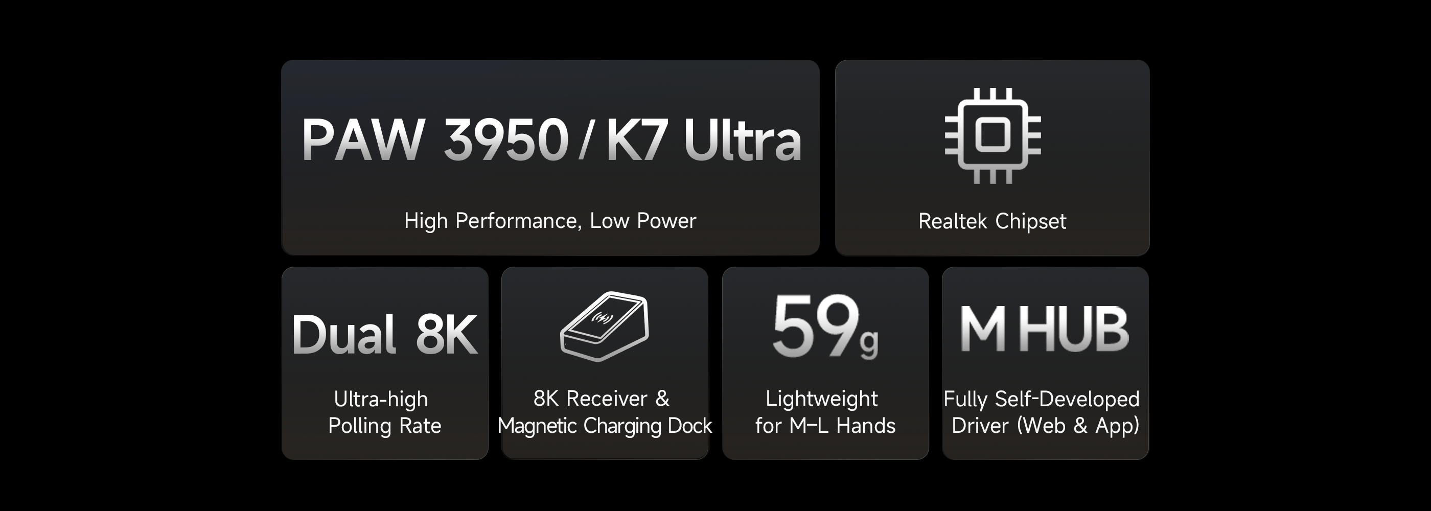 Chuột Mchose K7 Ultra được trang bị cảm biến quang học PAW3950 đỉnh cao, hỗ trợ lên tới 42.000 DPI, tốc độ theo dõi 750 IPS cùng gia tốc 50G—đảm bảo độ chính xác tuyệt đối, phản hồi cực nhanh và khả năng bám chuột siêu mượt trên mọi bề mặt, kể cả pad thủy tinh cao cấp