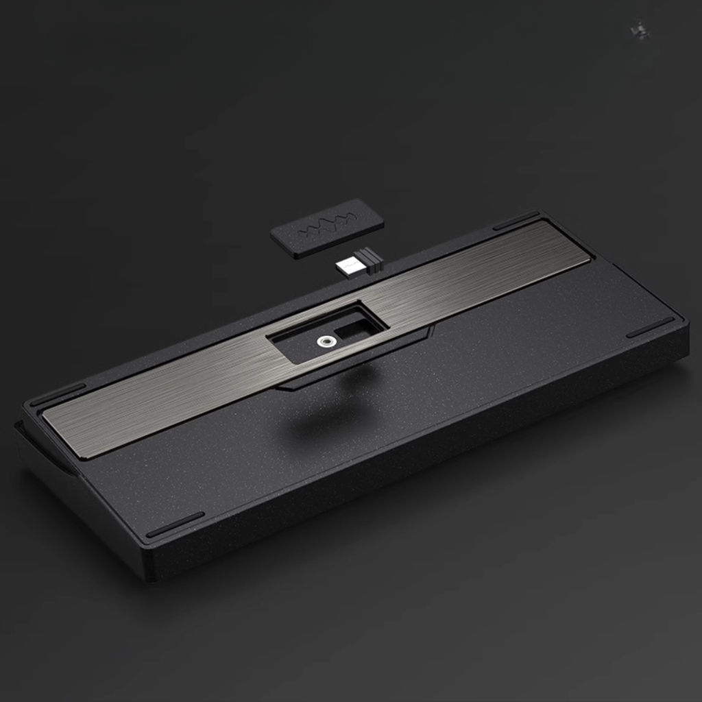 Để lấy receiver 2.4GHz của Wave75, vui lòng lật mặt sau bàn phím. Tại đây có nắp phím nam châm, bạn chỉ cần ấn nhẹ vào nắp để mở và lấy receiver ra, tham khảo hình bên dưới: