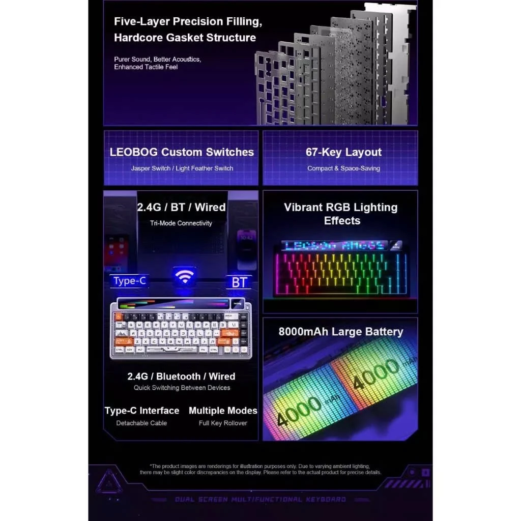 Leobog AMG65 là bàn phím cơ 65% nổi bật với thiết kế hiện đại, tích hợp hai màn hình hiển thị và sử dụng switch Jasper mang lại trải nghiệm gõ mượt mà.