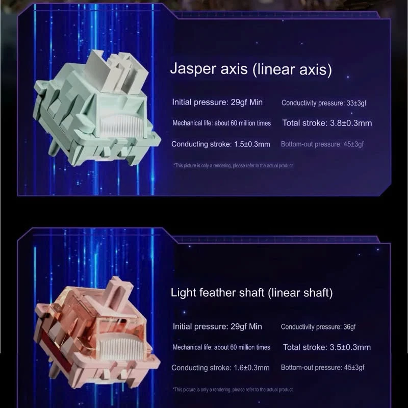 - Switch Jasper: Loại linear với lực nhấn nhẹ nhàng, hành trình êm ái và tuổi thọ lên đến 60 triệu lần nhấn.