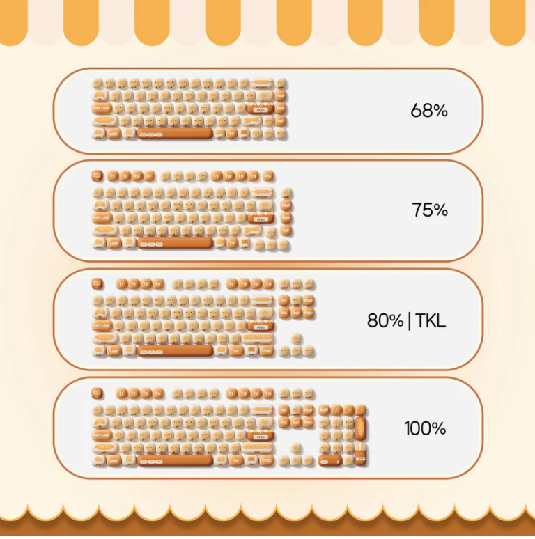 Dành cho những ai đam mê tùy biến, bộ keycap này có khả năng tương thích với nhiều layout như 60%, 64-key, 65%, TKL, 75%, 96%, 1800 compact và full-size. Điều này giúp bộ keycap Bánh Bao trở thành lựa chọn hoàn hảo cho mọi dòng bàn phím cơ, từ những chiếc bàn phím mini nhỏ gọn cho đến các bàn phím full-size đa dụng. THÔNG TIN KỸ THUẬT :